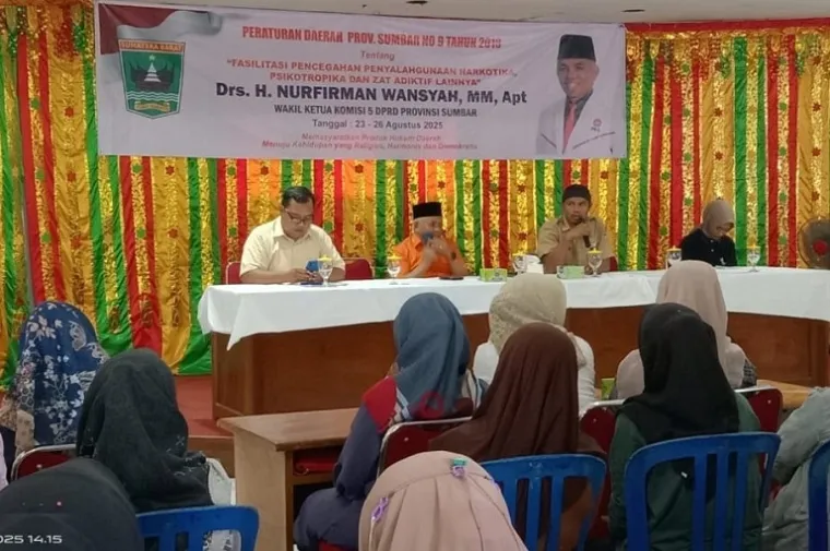 sarumpunnews.com- Wakil Ketua Komisi V DPRD Sumbar, Nurfirman Wansyah menggelar sosialisasi Peraturan Daerah (Perda) Nomor 9 Tahun 2018 tentang Fasilitasi Pencegahan Penyalahgunaan Narkotika, Psikotropika dan Zat Adiktif (NAPZA) di Wisma Umi Kalsum, Kecamatan Sungai Pagu, Kabupaten Solok Selatan, Senin (25/8).